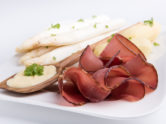 Gebackene Spargelspitzen in Wildschweinschinken mit Gurken-Dill-Sauce